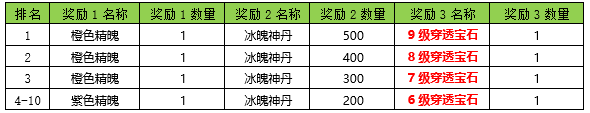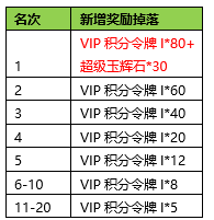 活动奖励:新增加超级玉辉石掉落;即:在原来活动奖励基础上(如原伤害排名第1核心奖励1200绑定元宝+其他奖励),伤害排名前20的队伍奖励新增VIP积分掉落。