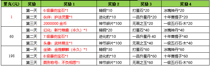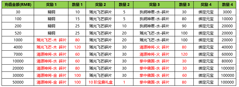活动内容:活动期间内玩家充值金额满足对应档位,将获得对应奖励。