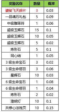 第二阶段奖励:消耗210非绑元宝可以参与抽奖;抽中5次婆娑飞天碎片*3的奖励后,该奖励将被锁定无法继续抽取。