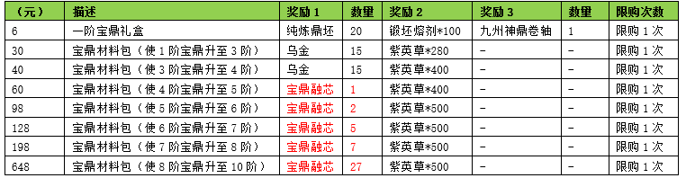 10阶初级宝鼎礼盒:开启后随机获得1个战力在80万-120万间的10阶九州宝鼎。