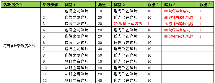 1. 活动期间内玩家活跃条件达到指定要求可以领橙色装备+橙色装备打造+瑶光飞芒碎片+仙羽碎片。