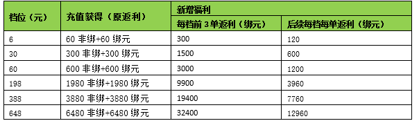 举例:某玩家充值第1单6元,将获得60非绑+60绑元+300绑元;第4单充值6元,将获得60非绑+60绑定+120绑元。