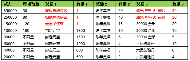 活动期间内玩家拥有的侠客战力达到要求,可以获得对应的奖励。