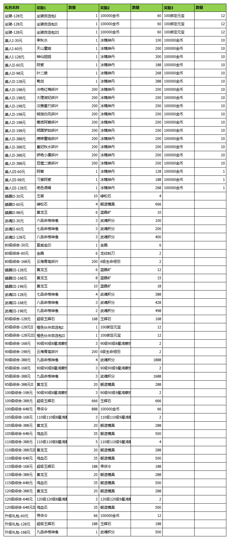 新服专属天山童姥礼盒:开启后随机获得【10阶初级宝鼎礼盒II】*1、【7级生命宝石】*1、【3000绑定元宝】*1、【2000绑定元宝】*1、【1000绑定元宝】*1,其中之一。