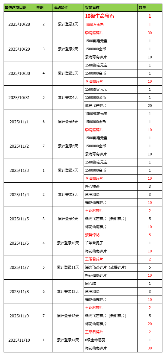 活动时间:10月28日开服后-11月10日23:59(14天)