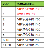 活动奖励:新增加VIP积分掉落;即:在原来活动奖励基础上(如原伤害排名第1核心奖励1200绑定元宝+其他奖励),伤害排名前20的队伍奖励新增VIP积分掉落。