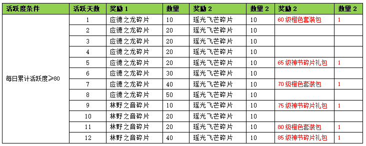 活动期间内玩家活跃条件达到指定要求可以领橙色装备+橙色装备打造+瑶光飞芒碎片+仙羽碎片。