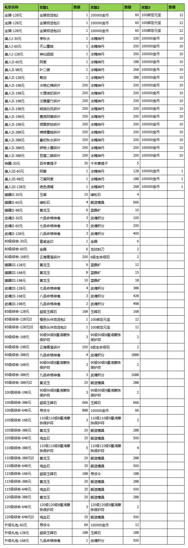 举例:坐骑、美人I、美人II、神翼、宝鼎材料礼包将在10月28日-11月3日上架;美人III、镇器II、武魂II、80级、85级综合礼包、升级礼包礼包将在11月4日-11月10日上架;镇器III、武魂III、90级、95级、升级礼包将在11月11日-11月17日上架,100级综合、升级礼包将在11月18日-11月24日上架;其他等级礼包与升级礼包上架时间以此类推……