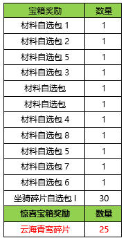 大区奖励臻选包XI:可在以下奖励中任选其一:【飞鸿踏雪碎片】*50、【诡谲兵刃宝匣】*2、【深玄阵法宝匣】*2、【曦光游影碎片】*50、【远山澄空碎片】*50、【紫绶幻焰碎片】*50、【南明离火碎片】*50、【八部天龙-金碎片】*50、【八部天龙-木碎片】*50、【八部天龙-水碎片】*50、【八部天龙-火碎片】*50、【八部天龙-土碎片】*50。