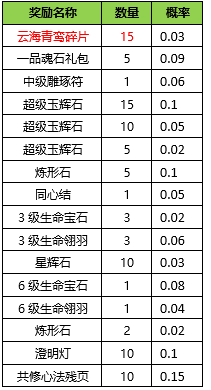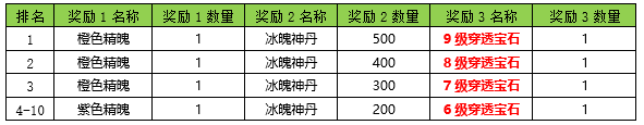 活动奖励:新增加超级玉辉石掉落;即:在原来活动奖励基础上(如原伤害排名第1核心奖励1200绑定元宝+其他奖励),伤害排名前20的队伍奖励新增超级玉辉石掉落。