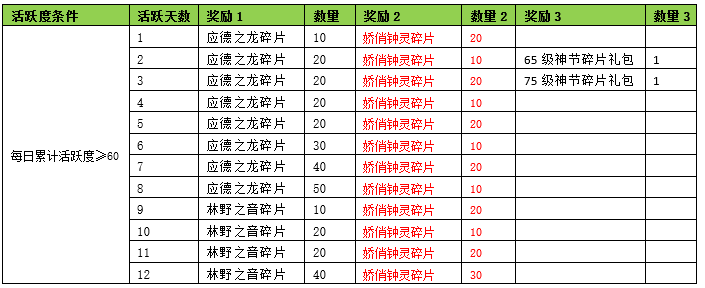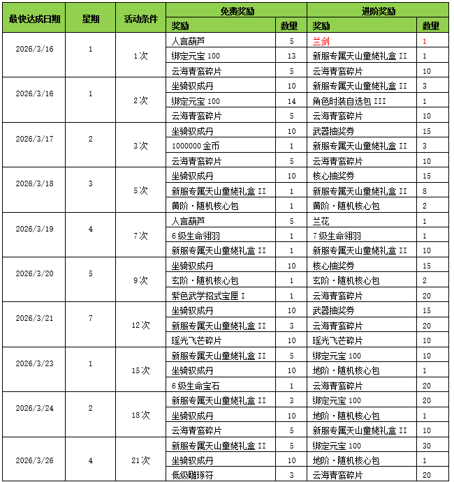 | 最快达成日期 | 星期 | 活动条件 | 奖励名称 | 数量 |