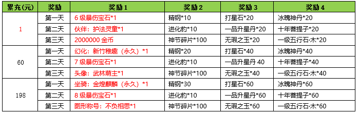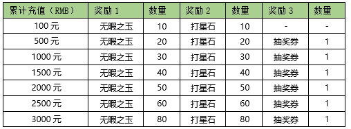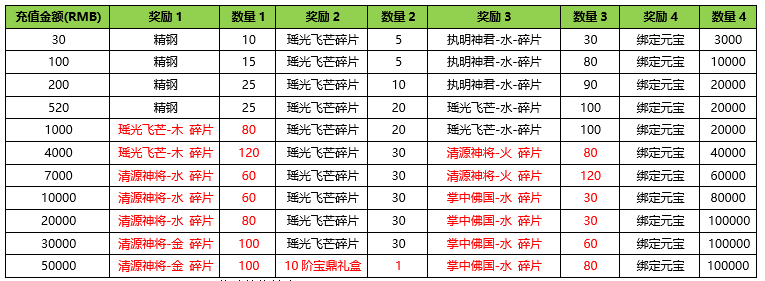 活动内容:活动期间内玩家充值金额满足对应档位,将获得对应奖励。
