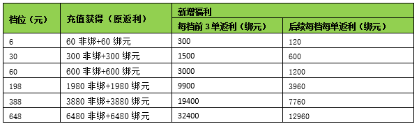 举例:某玩家充值第1单6元,将获得60非绑+60绑元+300绑元;第4单充值6元,将获得60非绑+60绑定+120绑元。