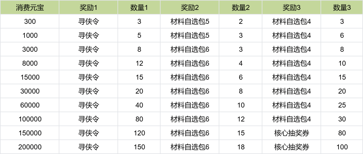 3. 本次消费最高档位200000非绑定元宝,所有奖励向上兼容.