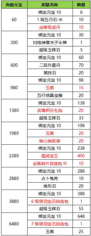 3.本次充值最高档位6480元宝,所有奖励向上兼容。即充值648RMB可领取所有奖励