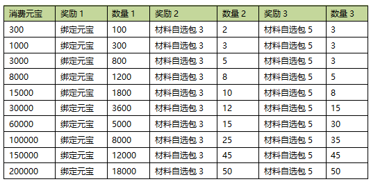 3. 本次消费最高档位200000非绑定元宝,所有奖励向上兼容.