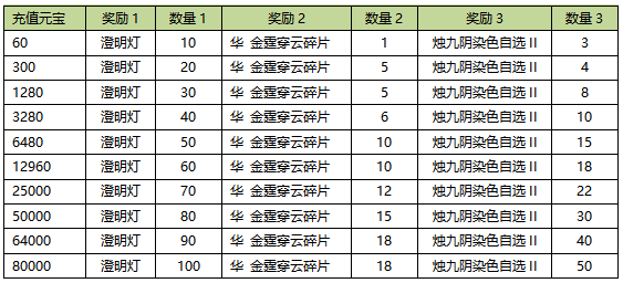 4.本次充值最高档位80000元宝,所有奖励向上兼容。即充值8000RMB可领取所有奖励。