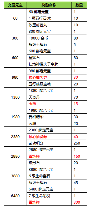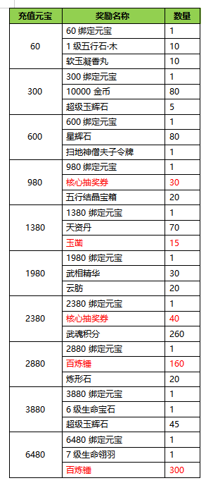 3.本次充值最高档位6480元宝,所有奖励向上兼容。即充值648RMB可领取所有奖励