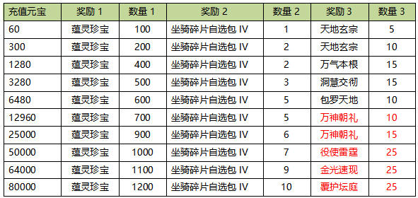 4.本次充值最高档位80000元宝,所有奖励向上兼容。即充值8000RMB可领取所有奖励;