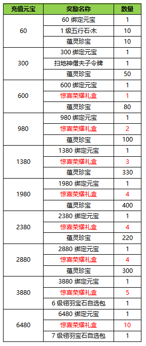 本次充值最高档位6480元宝,所有奖励向上兼容。即充值648RMB可领取所有奖励