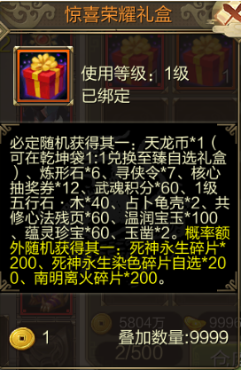 惊喜荣耀礼盒:必定随机获得其一:天龙币*1(可在乾坤袋1:1兑换至臻自选礼盒)、炼形石*6、寻侠令*7、核心抽奖券*12、武魂积分*60、1级五行石·木*40、占卜龟壳*2、共修心法残页*60、温润宝玉*100、蕴灵珍宝*60、玉凿*2。概率额外随机获得其一:死神永生碎片*200、死神永生染色碎片自选*200、南明离火碎片*200。