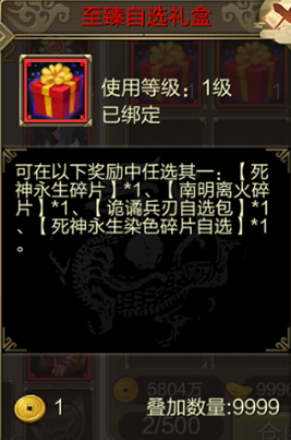 至臻自选礼盒:可在以下奖励中任选其一:【死神永生碎片】*1、【南明离火碎片】*1、【诡谲兵刃自选包】*1、【死神永生染色碎片自选】*1。
