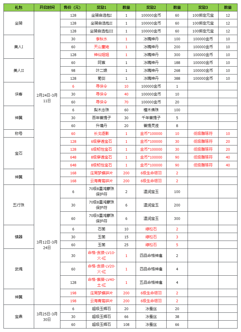 活动时间:2月24日开服后-3月30日(35天)
