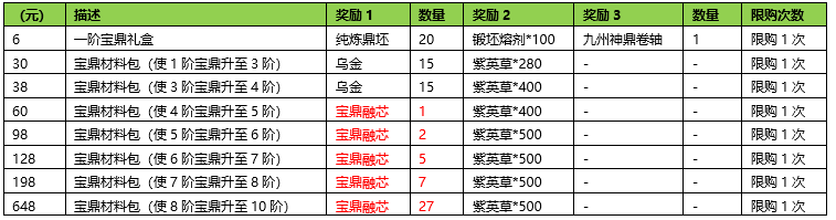 10阶初级宝鼎礼盒:开启后随机获得1个战力在80万-120万间的10阶九州宝鼎。
