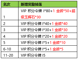 活动奖励:新增加金砖掉落;即:在原来活动奖励基础上(如原伤害排名第1核心奖励1200绑定元宝+其他奖励),伤害排名前20的队伍奖励新增金砖+VIP积分掉落。