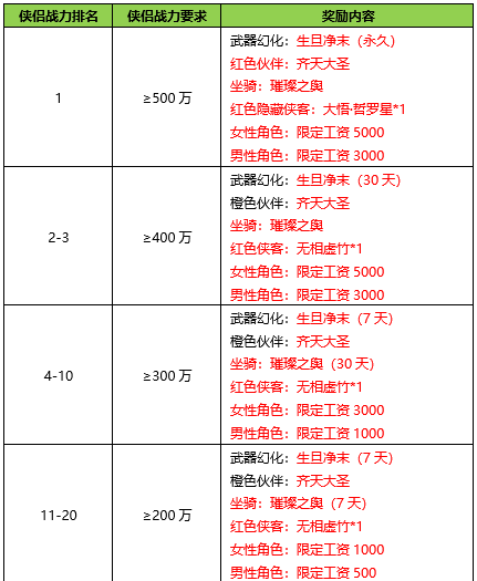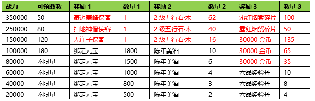 活动期间内玩家拥有的侠客战力达到要求,可以获得对应的奖励。