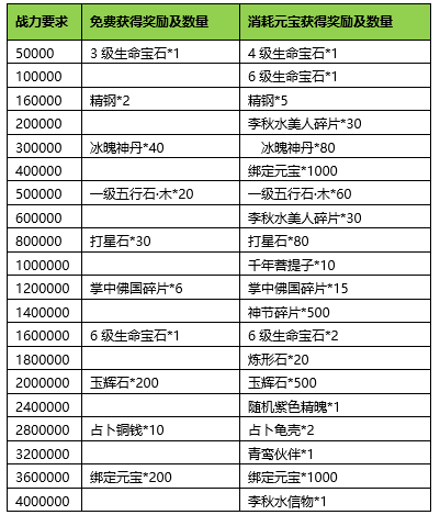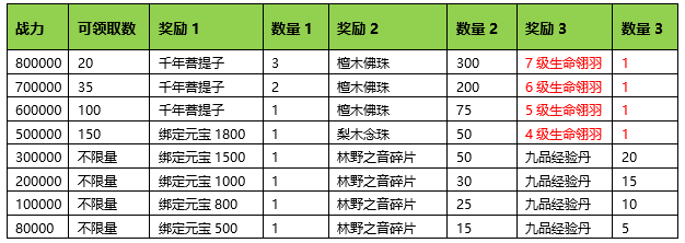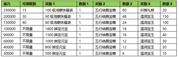 活动期间内玩家拥有的五行珠战力达到要求,可以获得对应的奖励。