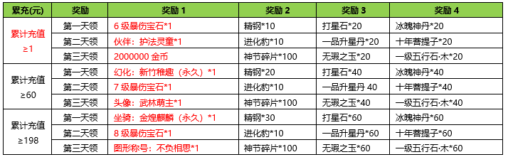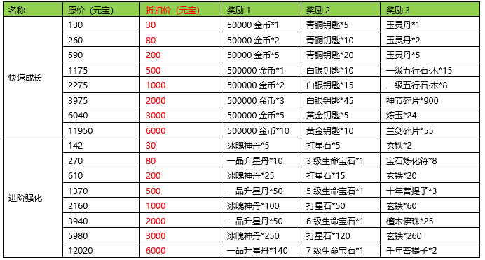 活动内容:玩家可以通过较低的元宝获得更高价值的成长道具和强化道具。