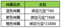活动内容:活动期间内,神翼达到特定等级,将获得额外绑定元宝。
