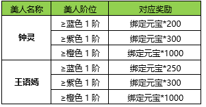 活动内容:活动期间内,拥有钟灵和王语嫣,且提升至目标品阶则可领取奖励。