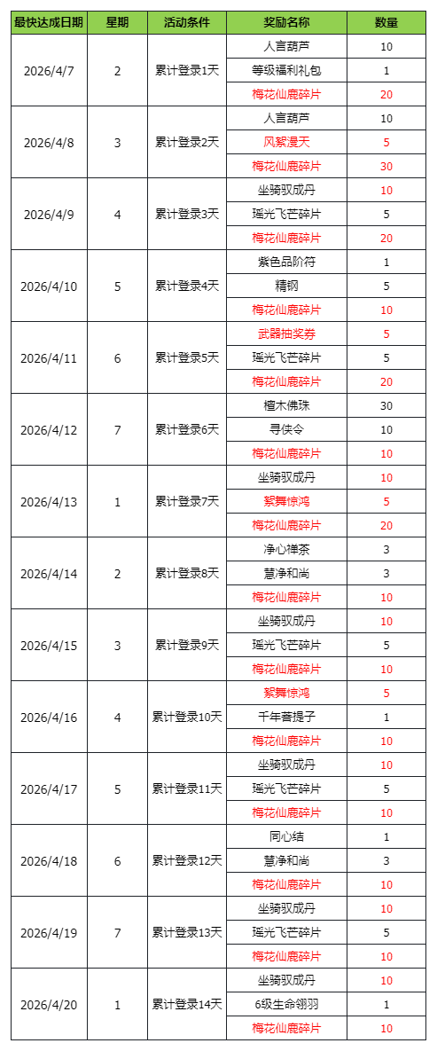 活动时间:4月7日开服后-4月20日23:59(14天)