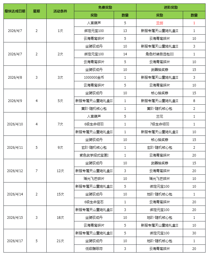 活动时间:4月7日开服后-4月12日23:59(6天)