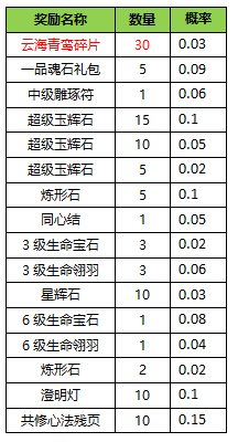 第二阶段奖励:消耗210非绑元宝可以参与抽奖;抽中3次云海青鸾碎片*30的奖励后,该奖励将被锁定无法继续抽取。
