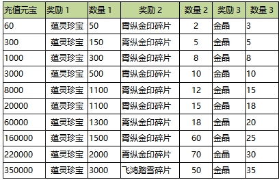 2.活动期间内,玩家通过游戏进行元宝充值,达到指定要求即可领取对应奖励;
