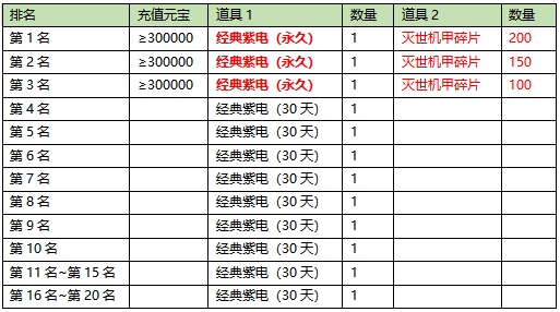 3.截至活动结束时,每个下活动期间累积充值元宝排行1-20名的玩家将获得对应排行榜奖励;