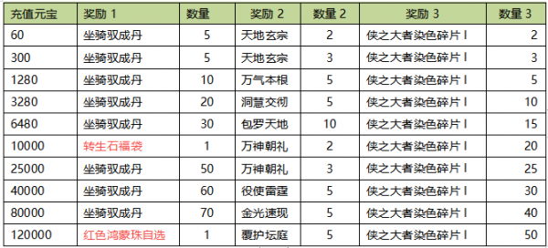 3. 本次充值最高档位120000元宝,所有奖励向上兼容。即充值12000RMB可领取所有奖励;