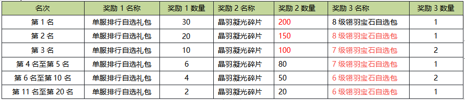单服排行榜奖励:打开后可任选其一:重楼精华*1、冰魄神丹*80、软玉凝香丸*80、共修心法残页*80、一品升星丹*80、云肪*8、无瑕之玉*160、炼形石*8、武器抽奖券*16、核心抽奖券*16、百炼锤*80、绘星笔*160、武魂积分*80、星辉石*88、五行结晶宝箱*16、天资丹*40、玉辉石*80、温润宝玉*135、打星石*50、蕴灵珍宝*80。